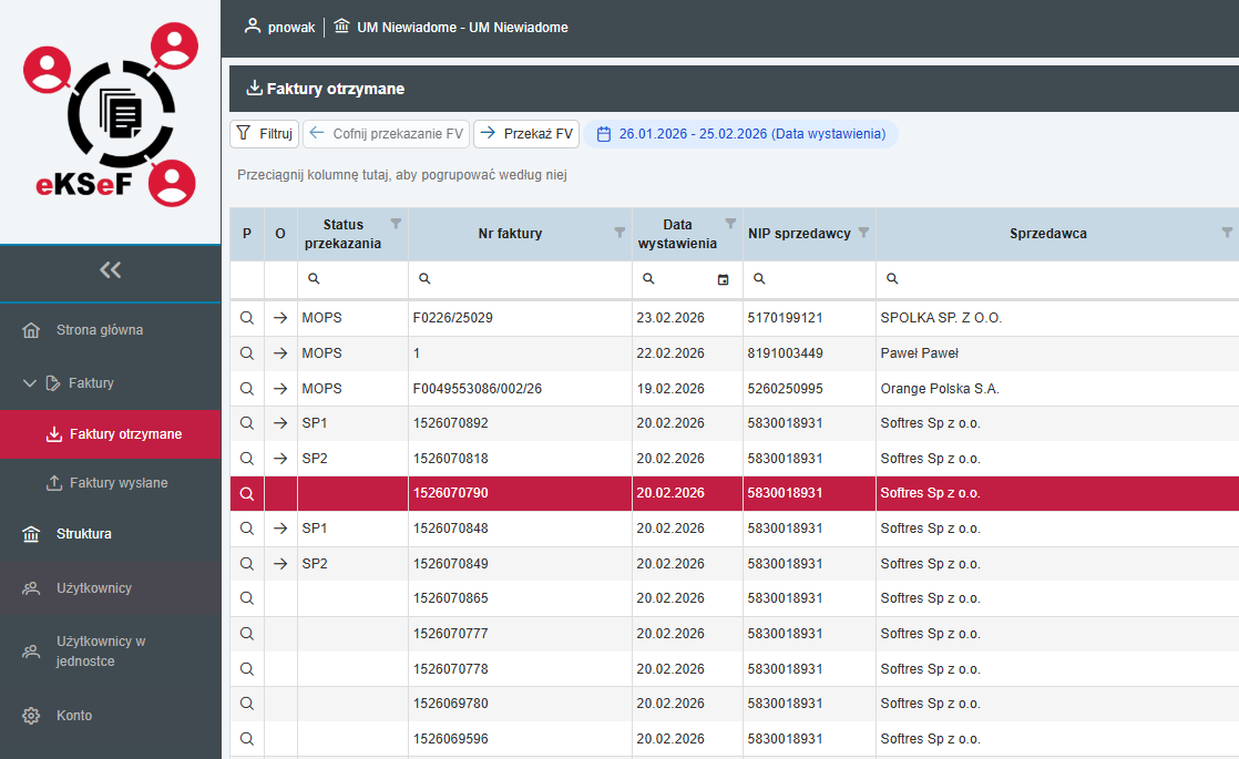 Moduł Faktury otrzymane służy do przeglądania i zarządzania dokumentami, które wpłynęły do jednostki za pośrednictwem Krajowego Systemu e-Faktur.