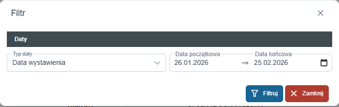 2. Filtr daty: W kolumnie "Data wystawienia" kliknij ikonę kalendarza, aby wybrać konkretny dzień.