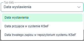 3. Przycisk "Filtruj": Znajduje się nad tabelą. Pozwala na zaawansowane filtrowanie dokumentów według zadanych parametrów. Faktury można filtrować po trzech typach daty: Data wystawienia, Data przyjęcia w systemie KSeF oraz Data trwałego zapisu w repozytorium KSeF. Dodatkowo możemy wybrać okres po którym chcemy przefiltrować faktury.