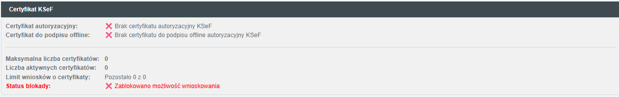 Jeśli widzisz komunikat "Brak certyfikatu", funkcje wysyłania i odbierania faktur będą zablokowane. Aby to naprawić, skorzystaj z przycisku "Załaduj certyfikat KSeF".