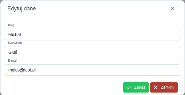 - Edytuj dane: Pozwala na aktualizację imienia, nazwiska oraz adresu e-mail.