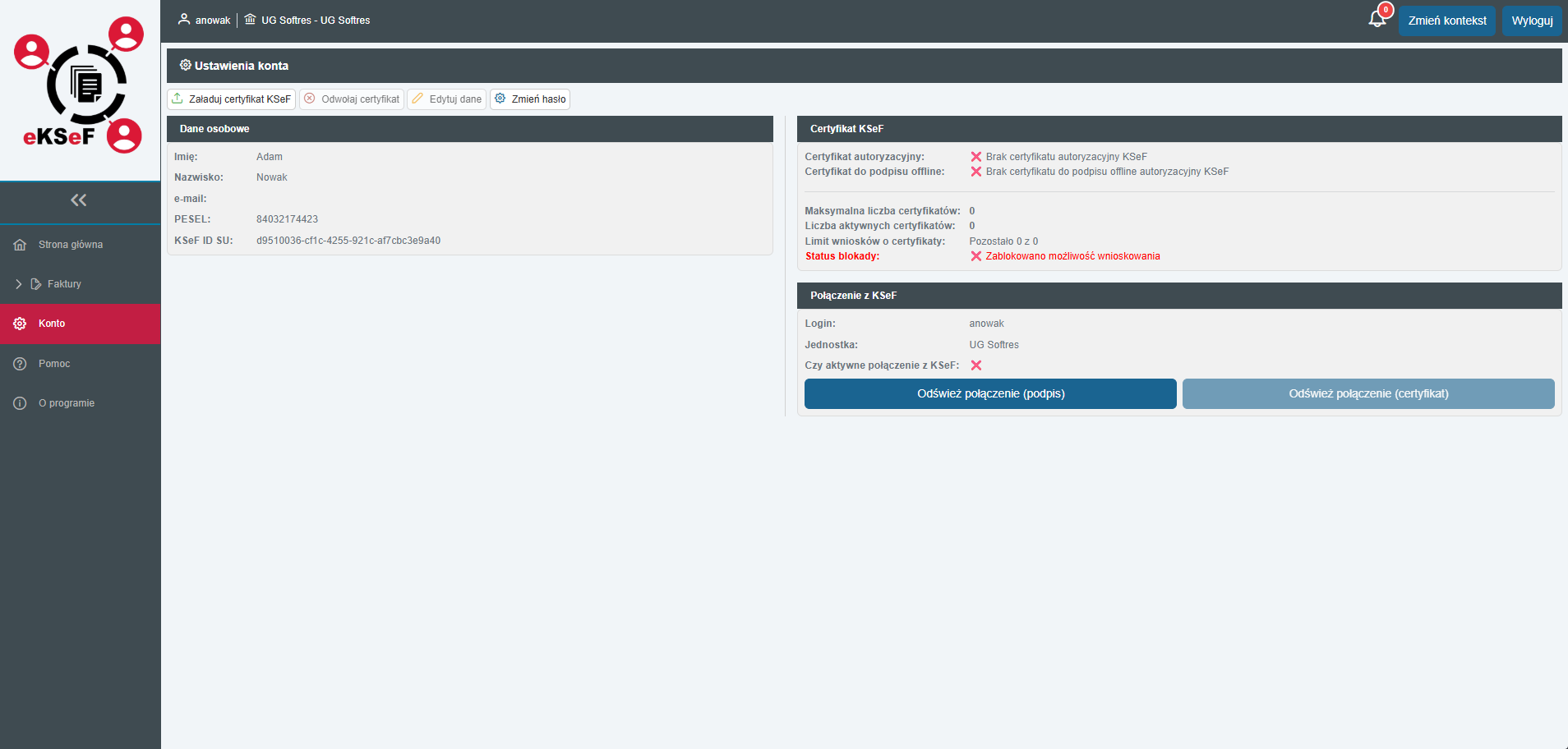 Zakładka Konto pozwala na zarządzanie profilem zalogowanego użytkownika oraz konfigurację certyfikatów niezbędnych do autoryzacji w Krajowym Systemie e-Faktur.