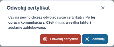Aby trwale usunąć certyfikaty, kliknij czerwony przycisk Odwołaj certyfikat. Jeśli otworzyłeś to okno przypadkowo, kliknij Zamknij lub ikonę X, aby zachować obecne ustawienia.