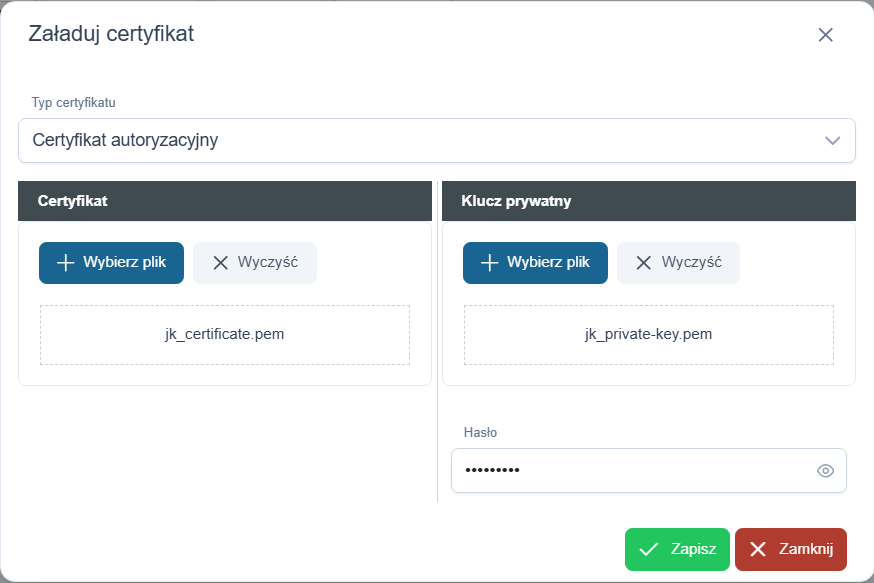 Należy załadować wyłącznie certyfikaty, których brakuje w systemie. Jeżeli wcześniej nie zostały wygenerowane certyfikaty, system podczas udanego odświeżenia połączenia z KSeF wygeneruje brakujące certyfikaty. W przypadku wcześniejszego generowania certyfikatu system poprosi o załadowanie go do brokera.