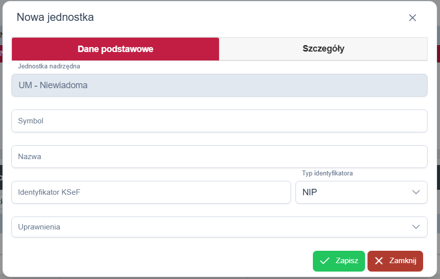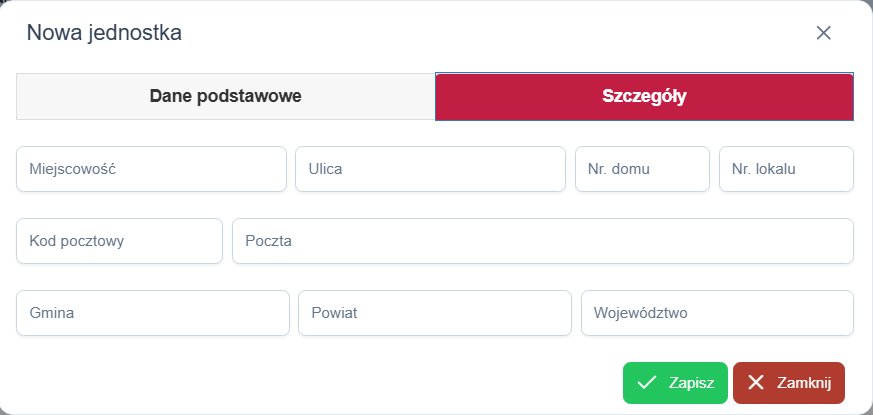 Kliknięcie przycisku Dodaj (lub Edytuj po zaznaczeniu rekordu) otwiera okno konfiguracji jednostki. Formularz jest podzielony na dwie zakładki: Dane podstawowe oraz Szczegóły.