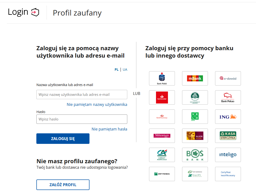 4. Zaloguj się: Wybierz metodę Profil Zaufany (lub e-dowód, jeśli korzystasz). Następnie zaloguj się tak, jak logujesz się do urzędu (np. przez swój bank).