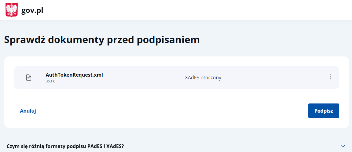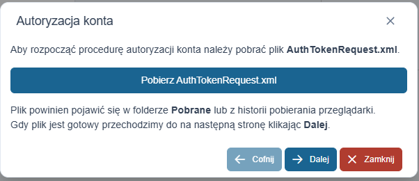 - Kliknij ciemnoniebieski przycisk Pobierz AuthTokenRequest.xml.