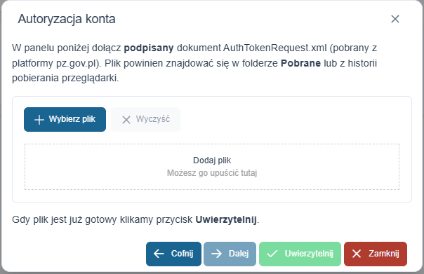 Otworzy się okno "Autoryzacja konta". Twoim zadaniem jest pobranie pliku, który zawiera prośbę Twojego urzędu/jednostki o dostęp do systemu faktur.