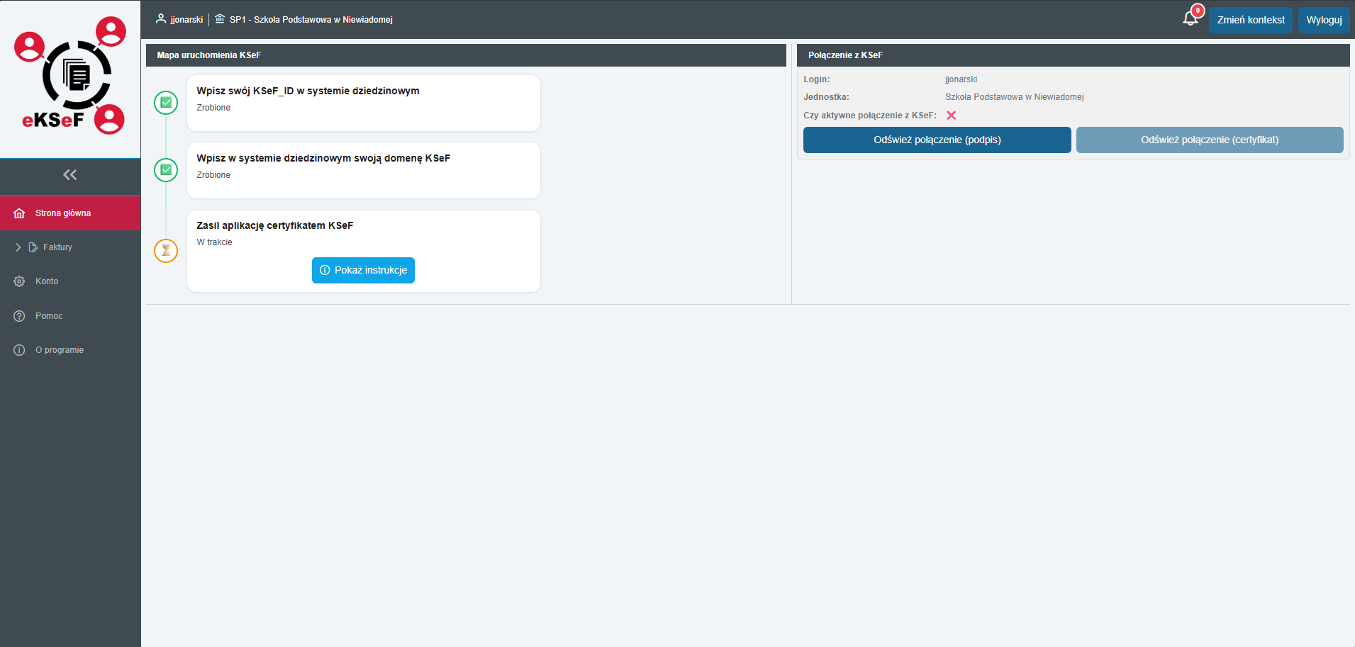 - Czy aktywne połączenie z KSeF: Zmieni się na zielony znacznik ✅.