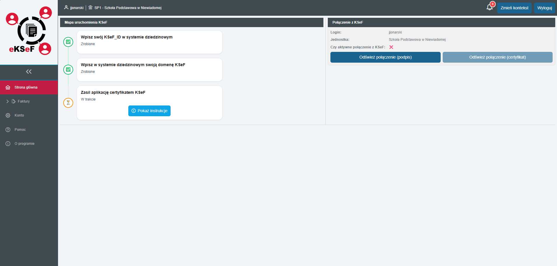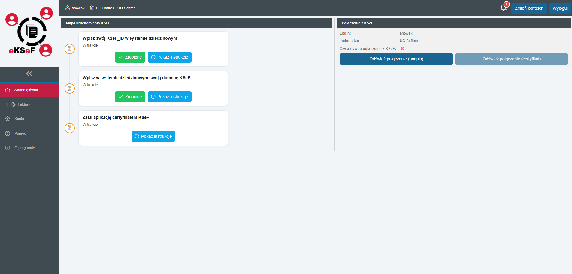 - Górny panel: Wyświetla zalogowanego użytkownika, aktywną jednostkę oraz przycisk Zmień kontekst (do przełączania się między urzędami).
