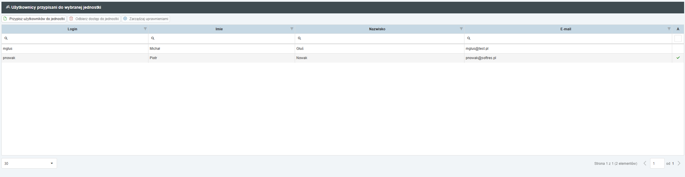 - Odbierz dostęp do jednostki: Odłącza użytkownika od wybranej bazy danych (nie usuwa konta użytkownika z systemu, a jedynie blokuje mu wstęp do tej konkretnej jednostki).
