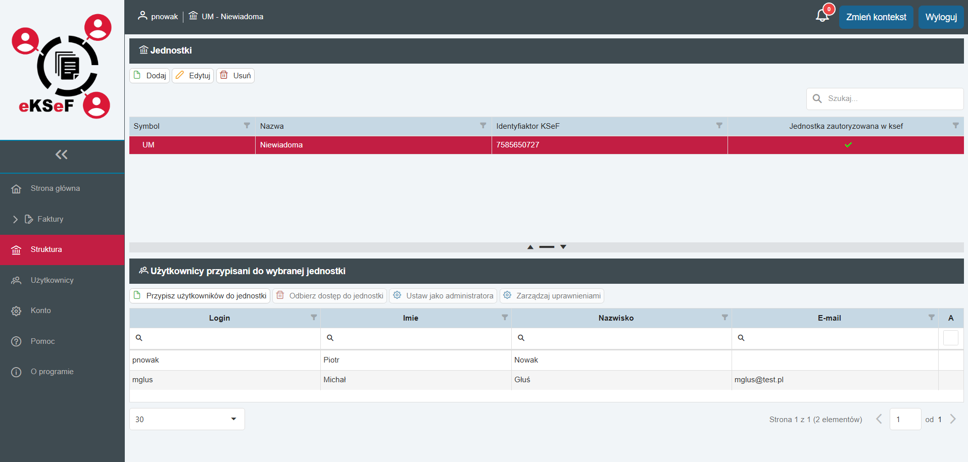 Moduł Struktura stanowi centrum zarządzania hierarchią jednostek w systemie eKSeF. Pozwala on na definiowanie podmiotów (np. Urząd Miasta, jednostki budżetowe, oddziały) oraz precyzyjne przypisywanie do nich kadr.