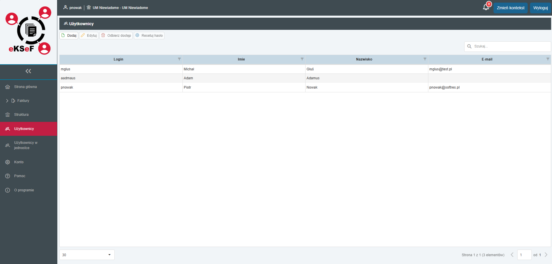 Ten moduł to centralna baza wszystkich pracowników zarejestrowanych w systemie eKSeF. Administrator ma tutaj możliwość tworzenia kont, edycji danych osobowych oraz zarządzania bezpieczeństwem (reset haseł).