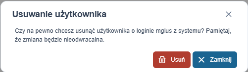 Usunięcie użytkownika jest ostateczne. Straci on dostęp do wszystkich jednostek, do których był przypisany. Jeśli chcesz tylko zablokować dostęp do jednego urzędu, skorzystaj z modułu Użytkownicy w jednostce.