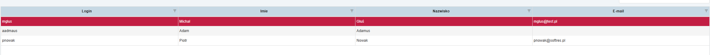 - Filtry kolumnowe: Kliknij ikonę lupy pod nagłówkiem (np. Login lub Nazwisko), aby znaleźć konkretną osobę.