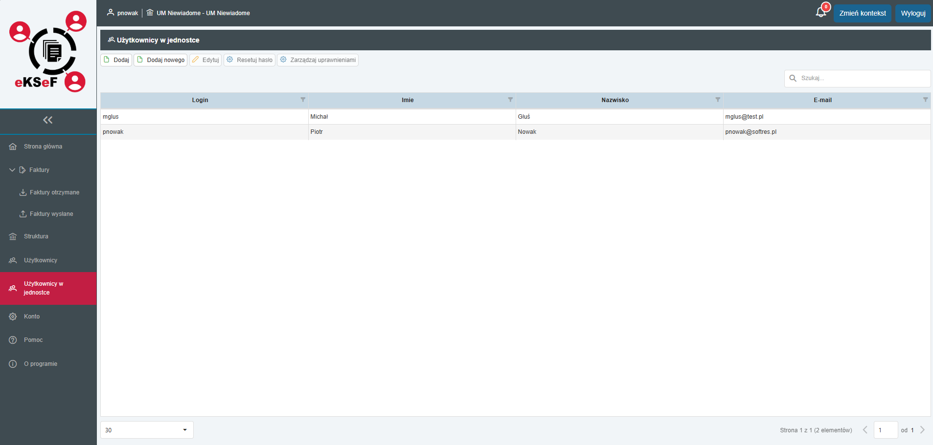 Pamiętaj, że ten moduł dotyczy tylko jednostki wybranej na górnym pasku (np. UM Niewiadoma). Jeśli chcesz dodać użytkownika do innej szkoły, najpierw użyj przycisku Zmień kontekst.